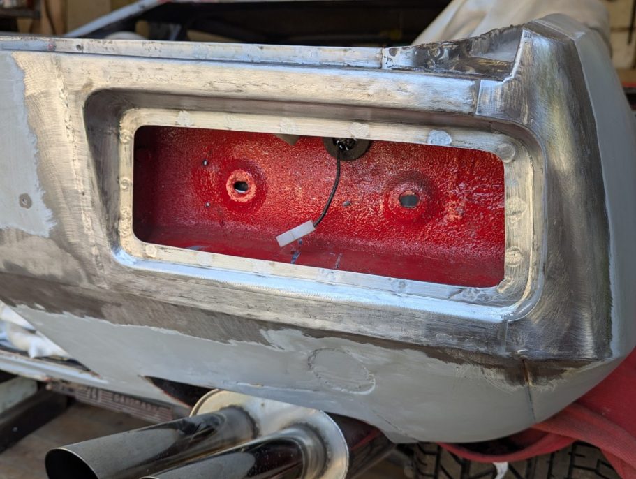 Tail light & wing corner fabricated in house, butt welded. Metal finished.